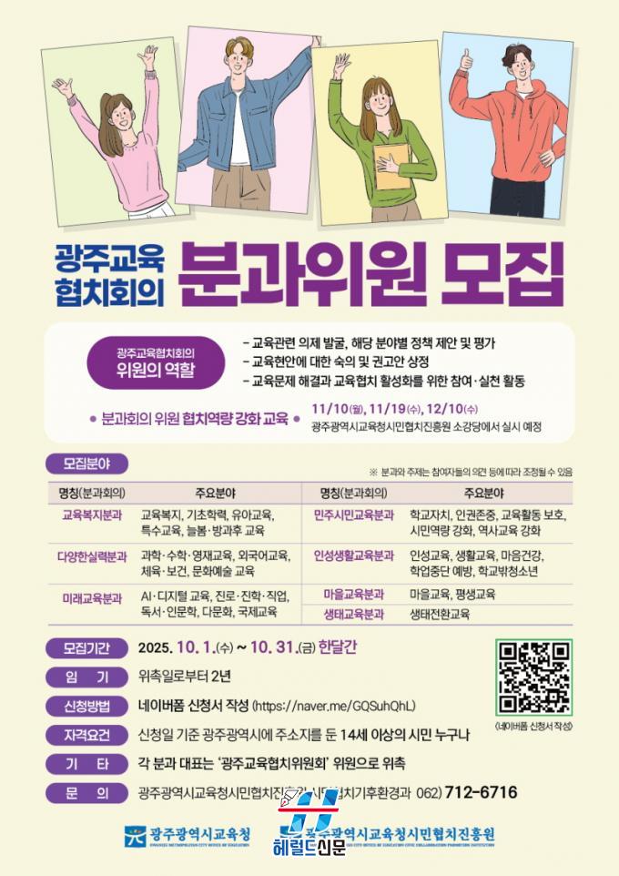 ¡®±¤ÁÖ±³À°ÇùġȸÀÇ¡¯´Â Áö¿ª»çȸ¿Í ÇÔ²²ÇÏ´Â ½Ã¹ÎÇùÄ¡ Ȱ¼ºÈ¸¦ À§ÇØ Áö³ 2023³â 1±â¸¦ ¸ðÁýÇß´Ù. ½Ã¹ÎÇùÄ¡ÁøÈï¿øÀº 1±â À§¿øÀÇ ÀӱⰡ ¿À´Â 10¿ù 31ÀÏ Á¾·áµÊ¿¡ µû¶ó 2±â À§¿øÀ» ¸ðÁýÇÑ´Ù.