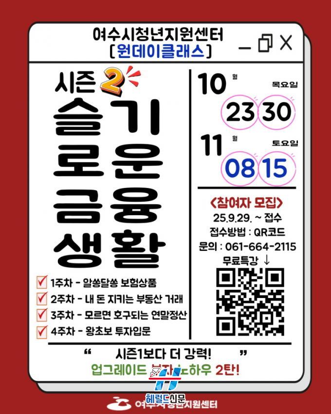 [Çì·²µå½Å¹® = ³ë½Â¾ð ±âÀÚ] ¿©¼ö½Ã(½ÃÀå Á¤±â¸í)´Â ¿À´Â 10¿ù 23ÀÏ(¸ñ) ¿ÀÈÄ 6½Ã 30ºÐ ¿©¼ö½Ãû³âÁö¿ø¼¾ÅÍ¿¡¼­ û³âµéÀÇ ±ÝÀ¶ ÀÌÇØµµ Çâ»ó°ú °ÇÀüÇÑ ±ÝÀ¶ ½À°ü Çü¼ºÀ» À§ÇÑ ¹«·á Ư°­ ¡®½ÃÁð2 ½½±â·Î¿î ±ÝÀ¶»ýȰ¡¯ ÀÏÀÏ °­Á¸¦ ¿î¿µÇÑ´Ù.