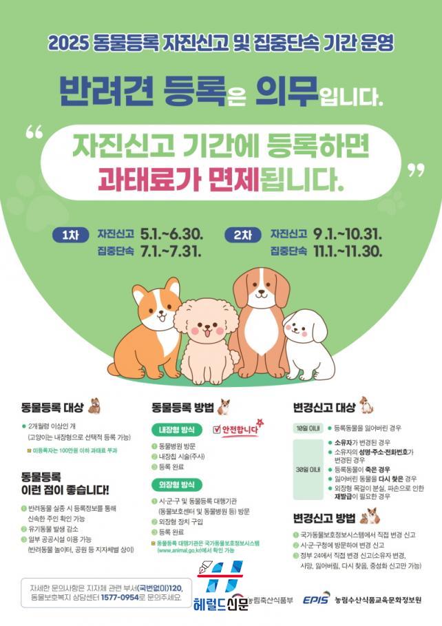 ÇöÇà µ¿¹°º¸È£¹ý¿¡ µû¸£¸é, ¹Ý·Á ¸ñÀûÀ¸·Î ±â¸£´Â »ýÈÄ 2°³¿ù ÀÌ»óÀÇ °³ ¼ÒÀ¯ÀÚ´Â ¹Ýµå½Ã µ¿¹°µî·ÏÀ» ¸¶ÃÄ¾ß ÇÑ´Ù. ¶ÇÇÑ, µî·Ï ÀÌÈÄ ¹Ý·Áµ¿¹°À» ÀÒ¾î¹ö·ÈÀ» ¶§´Â 10ÀÏ À̳»¿¡, ¼ÒÀ¯ÀÚ°¡ ¹Ù²î°Å³ª ¹Ý·Áµ¿¹°ÀÌ »ç¸ÁÇÏ´Â µî Á¤º¸ º¯°æÀÌ ÇÊ¿äÇÒ °æ¿ì 30ÀÏ À̳»¿¡ º¯°æ ½Å°í¸¦ ¿Ï·áÇØ¾ß ÇÑ´Ù. À̸¦ ÁöŰÁö ¾ÊÀ¸¸é ÃÖ´ë 60¸¸¿ø ÀÌÇÏÀÇ °úÅ·ᰡ ºÎ°úµÈ´Ù.