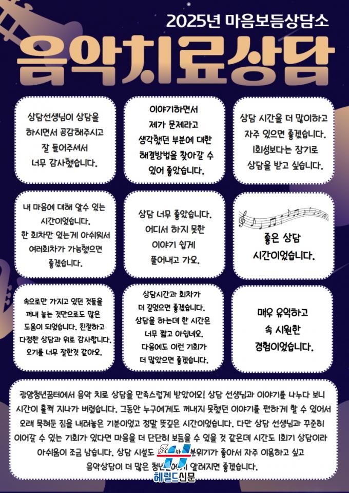 À½¾ÇÄ¡·á»ó´ã¿¡ Âü¿©ÇÑ ¶Ç ´Ù¸¥ û³âÀº ¡°À½¾ÇÀ» ÅëÇØ °¨Á¤À» ÀÚ¿¬½º·´°Ô Ç¥ÇöÇÒ ¼ö ÀÖ¾ú°í, »ó´ã»ç¿ÍÀÇ ´ëȸ¦ ÅëÇØ ¸¶À½ÀÌ ÇÑ°á °¡º¿öÁ³´Ù¡±¸ç ¡°½º½º·Î¸¦ À§·ÎÇÒ ¼ö ÀÖ´Â µû¶æÇÑ ½Ã°£À̾ú´Ù¡±°í ÀüÇß´Ù.
