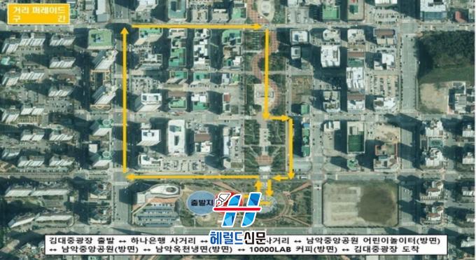 ÃàÁ¦ÀÇ ´ëÇ¥ÇÁ·Î±×·¥ÀÎ °Å¸® ÆÛ·¹À̵å´Â 15ÀÏ ¿ÀÈÄ 2½ÃºÎÅÍ 5½Ã±îÁö ÁøÇàµÇ¸ç, ±è´ëÁß±¤Àå ¡æ ÇϳªÀºÇà »ç°Å¸® ¡æ ±¹¹ÎÀºÇà »ç°Å¸® ¡æ ³²¾ÇÁß¾Ó°ø¿ø ¾î¸°À̳îÀÌÅÍ ¹æ¸é ¡æ ³²¾ÇÁß¾Ó°ø¿ø ¡æ ³²¾Ç¿Áõ³Ã¸é ¡æ ±¸ 10,000 LAB Ä¿ÇÇ ¡æ ±è´ëÁß±¤Àå ±¸°£Àº ÆÛ·¹ÀÌµå ½Ã°£ Àü¸é Â÷·® ÅëÁ¦°¡ ÀÌ·ç¾îÁø´Ù.