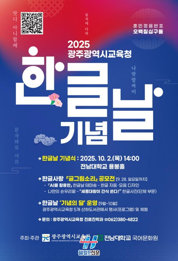 ±¤ÁÖ±¤¿ª½Ã±³À°Ã»Àº ¿À´Â 10¿ù 2ÀÏ Àü³²´ë ¿ëºÀȦ¿¡¼ Àü³²´ëÇб³¿Í °øµ¿À¸·Î ¡®579µ¹ Çѱ۳¯ ±â³ä½Ä¡¯À» °³ÃÖÇÑ´Ù. À̳¯ ±â³ä½ÄÀº ÀÌÁ¤¼± ±³À°°¨°ú À̱ٹè Àü³²´ë ÃÑÀå µîÀÌ Âü¼®ÇÑ °¡¿îµ¥ ÈÆ¹ÎÁ¤À½ ÇØ·Êº» ³¶µ¶, ÇÑ±Û ¹ßÀü À¯°øÀå Æ÷»ó, ÃàÇϰø¿¬ ¼øÀ¸·Î ¿¸°´Ù.