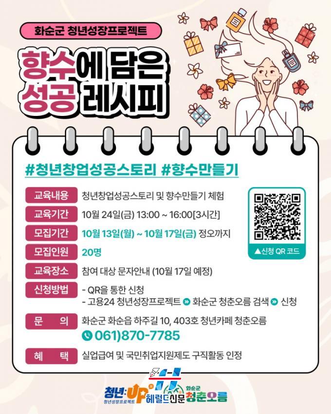 ÇÁ·Î±×·¥Àº °¢°¢ 2025³â 10¿ù 23ÀÏ(¸ñ), 24ÀÏ(±Ý) ¿ÀÈÄ 13½ÃºÎÅÍ 3½Ã°£ µ¿¾È ÁøÇàµÇ¸ç, Àå¼Ò´Â Âü¿©ÀÚ¿¡°Ô °³º° ¹®ÀÚ·Î ¾È³»µÉ ¿¹Á¤ÀÌ´Ù. û³â ´©±¸³ª ½ÅûÀÌ °¡´ÉÇϸç, ¼±Âø¼ø 20¸í ¸¶°¨ÀÌ´Ù. ½Åû ¹æ¹ýÀº Æ÷½ºÅÍ QRÄÚµå ¶Ç´Â °í¿ë24 ¡æ û³â¼ºÀåÇÁ·ÎÁ§Æ® ¡æ È­¼ø±º ûÃá¿À¸§À» °Ë»öÇÏ¿© ½ÅûÇÒ ¼ö ÀÖ´Ù.
