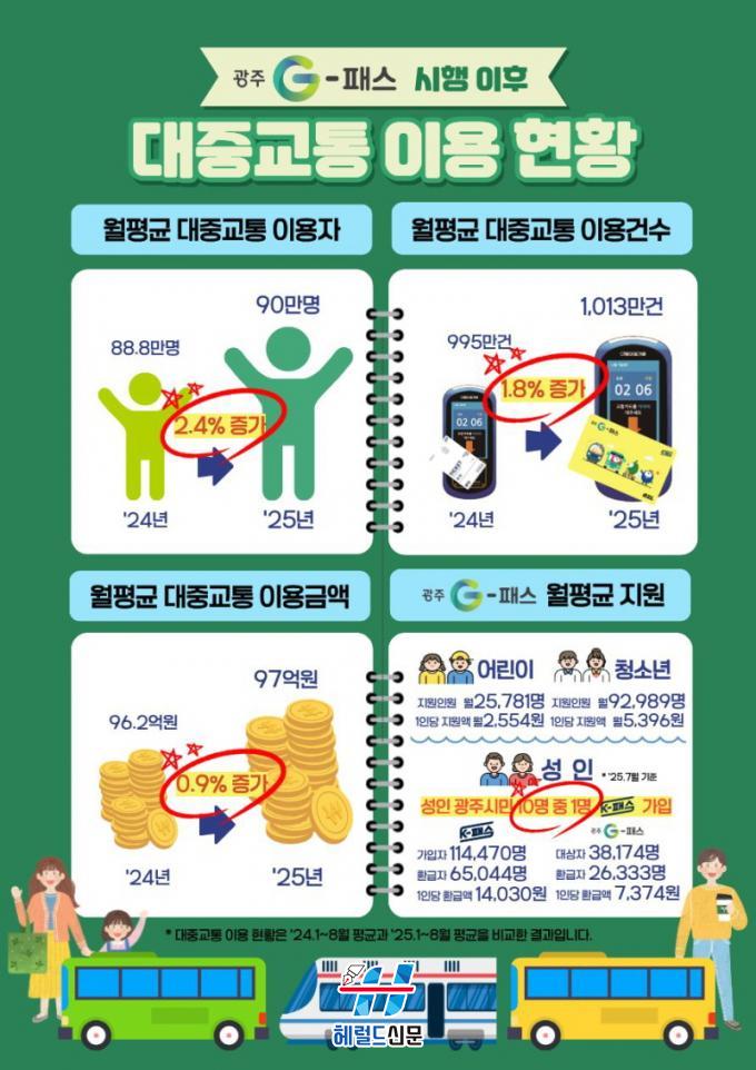 ¡®±¤ÁÖG-ÆÐ½º¡¯¿Í ¿¬°èµÈ ¡®K-ÆÐ½º¡¯ÀÇ Áö¿ª °¡ÀÔÀÚµµ ´ëÆø ´Ã¾ú´Ù. ±¤ÁÖÁö¿ª K-ÆÐ½º °¡ÀÔÀÚ´Â 2024³â ¸» 4¸¸5749¸í¿¡¼­ 2025³â 8¿ù ¸» 11¸¸4470¸íÀ¸·Î 8°³¿ù ¸¸¿¡ 6¸¸8721¸í, 2.5¹è Áõ°¡Çß´Ù. ¿ÃÇØ 7¿ù ±âÁØ 15ȸ ÀÌ»ó ´ëÁß±³ÅëÀ» ÀÌ¿ëÇØ ȯ±ÞÀ» ¹ÞÀº ½Ã¹ÎÀº 6¸¸5044¸íÀ̸ç, 1ÀÎ´ç ¿ùÆò±Õ 1¸¸4030¿øÀ» µ¹·Á¹Þ¾Ò´Ù.