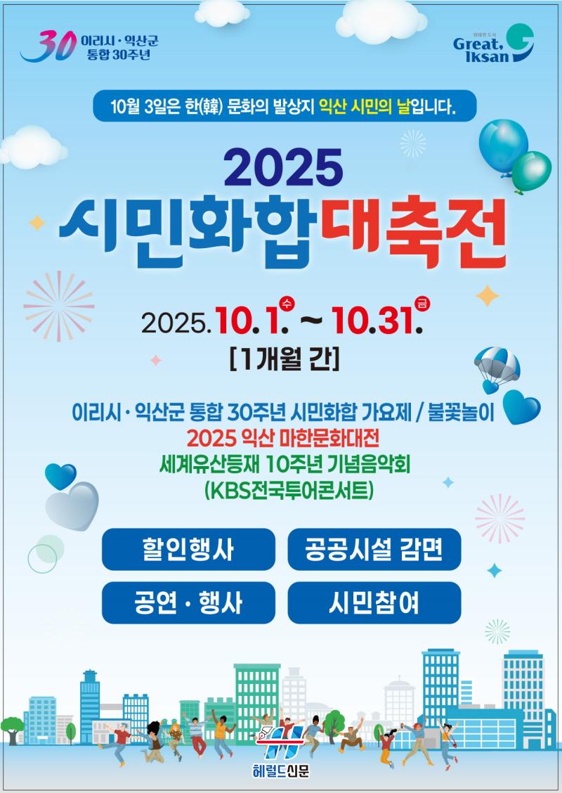 ÀÍ»ê½Ã´Â À̸®½Ã¡¤Àͻ걺 ÅëÇÕ 30ÁÖ³âÀ» ±â³äÇØ 10¿ù ÇÑ ´Þ°£ ½Ã¹ÎµéÀÌ Àϻ󿡼­ ¹®È­¿Í ¿©°¡¸¦ Áñ±æ ¼ö ÀÖ´Â '½Ã¹ÎÈ­ÇÕ´ëÃàÀü'À» À̾°í ÀÖ´Ù.