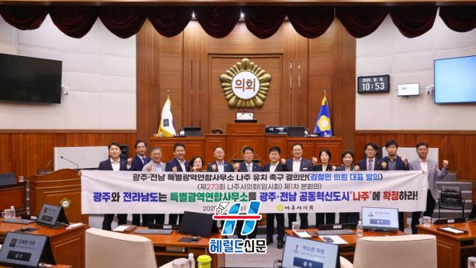³ªÁÖ½ÃÀÇȸ´Â À̹ø °ÇÀǾÈÀ» ÅëÇØ ¡ã±¤ÁÖ¡¤Àü³² Ưº°±¤¿ª¿¬ÇÕ ±Ô¾à¿¡ »ç¹«¼Ò ¼ÒÀçÁö¸¦ ¸í½ÃÀûÀ¸·Î ±¤ÁÖ¡¤Àü³² °øµ¿Çõ½Åµµ½Ã(³ªÁֽà ºû°¡¶÷µ¿)À¸·Î È®Á¤ÇÒ °Í°ú ¡ãÈļÓÇùÀÇ Àü °úÁ¤¿¡¼ »ó¡¼º¡¤Á¤ÇÕ¼º¡¤°Å¹ö³Í½º Á¢±Ù¼ºÀ» °¡»ê¿ä¼Ò·Î ¸í¹®ÈÇϰí, ´Ù¸¥ Çö¾È°úÀÇ Á¤Ä¡Àû ±³È¯¡¤°Å·¡¸¦ ÀÏü ¹èÁ¦ÇÒ °Í, ¡ãÁ¤ºÎ¡¤±¤Áֽá¤Àü³²µµ´Â ³ªÁÖ À¯Ä¡¿¡ ÇÊ¿äÇÑ ÀÎÇÁ¶ó¿Í ¿¹»êÀ» Á¶¼ÓÈ÷ È®Á¤Çϰí, ¿¬ÇÕ Ãâ¹ü ÀÏÁ¤°ú ¿¬µ¿ÇØ ÇàÁ¤ °ø¹é ¾øÀÌ ÁýÇà °èȹÀ» Á¦½ÃÇÒ °ÍÀ» Ã˱¸Çß´Ù.