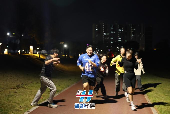 ¿ÀÈÄ 7½Ã, ½Å³ª´Â ÀüÀÚÀ½¾Ç(EDM)¿¡ ¸ÂÃç Áغñ ¿îµ¿À» ¸¶Ä£ 500¿© ¸íÀÇ Âü°¡ÀÚµéÀº ½ÅÈ£¿Í ÇÔ²² °¡Á·¡¤Ä£±¸ ´ÜÀ§·Î Á¶¸¦ ³ª´² Ãâ¹ßÇß´Ù. Ȳ·æÁ¤¿ø À½¾ÇºÐ¼ö µÚÆí¿¡¼ ½ÃÀÛÇØ Ȳ¹Ì¸£·£µå¸¦ ÇÑ ¹ÙÄû µ¹¾Æ ¡®Æ©ºê¡¯ Àå¾Ö¹°À» Åë°úÇϰí, ¿¬²ÉÁ¤¿øÀ» °ÅÃÄ ´Ù½Ã ½ÃÀÛÁ¡À¸·Î º¹±ÍÇÏ´Â 2.5km ÄÚ½º¿´´Ù.
