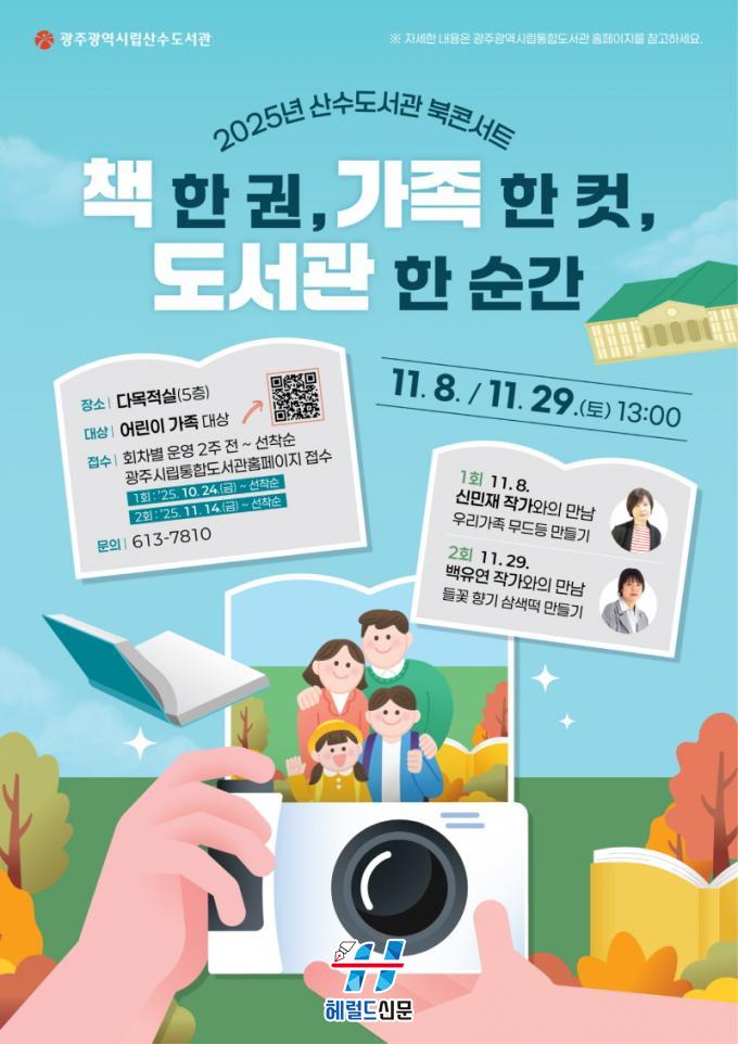 »ê¼öµµ¼­°üÀ» ÀÌ¿ëÇÏ´Â ¾î¸°ÀÌ °¡Á·Àº ´©±¸³ª Âü¿©ÇÒ ¼ö ÀÖÀ¸¸ç, Âü°¡ ½ÅûÀº 10¿ù 24ÀϺÎÅÍ ±¤Áֽø³µµ¼­°ü ´©¸®Áý(citylib.gwangju.go.kr)À» ÅëÇØ ¼±Âø¼ø(1ȸÂ÷-8ÀÏ 15°¡Á·, 2ȸÂ÷-29ÀÏ 12°¡Á·) Á¢¼öÇÑ´Ù. ÀÚ¼¼ÇÑ »çÇ×Àº ´©¸®ÁýÀ» Âü°íÇϰųª »ê¼öµµ¼­°ü(613-7810)À¸·Î ¹®ÀÇÇÏ¸é µÈ´Ù.