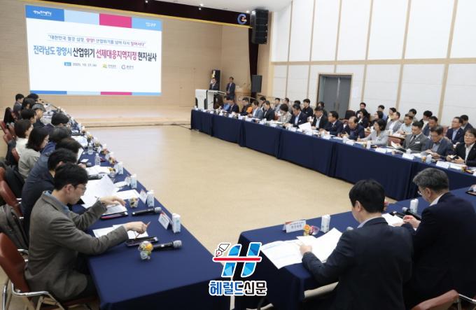 ±è±âÈ« Àü³²µµ Àü·«»ê¾÷±¹ÀåÀº ¡°±¤¾çÀº ±¹°¡ ö° »ý»êÀÇ 3ºÐÀÇ 1 ÀÌ»óÀ» ´ã´çÇÏ´Â ÇÙ½É »ê¾÷ °ÅÁ¡ÀÌÁö¸¸, ±Û·Î¹ú °æÀï ½ÉÈ¿Í ¿øÀÚÀç °¡°Ý º¯µ¿, °í±Ý¸® µî º¹ÇÕ À§±â¿¡ Á÷¸éÇß´Ù¡±¸ç ¡°À̹ø ÇöÁö ½Ç»ç¸¦ °è±â·Î Á¤ºÎ°¡ Áö¿ª À§±â »óȲÀ» ¸é¹ÐÈ÷ ÆÄ¾ÇÇØ ¹Ýµå½Ã »ê¾÷À§±â ¼±Á¦´ëÀÀÁö¿ªÀ¸·Î ÁöÁ¤ÇØÁÖ±æ °·ÂÈ÷ ¿äûÇÑ´Ù¡±°í ¸»Çß´Ù.
