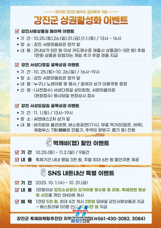 [Çì·²µå½Å¹® = Àü¿µ±Ô ±âÀÚ] °­Áø±ºÀÌ Á¦10ȸ °­Áø¸¸ ÃãÃß´Â °¥´ëÃàÁ¦ ±â°£ °­Áø »ó°¡ Ȱ·ÂÀ» À§ÇØ ¿À´Â 25ÀÏ, 26ÀÏ, 10¿ù 31ÀÏ, 11¿ù 1ÀÏ 4Àϰ£ ¿ÀÈÄ 1½ÃºÎÅÍ ¿ÀÈÄ 4½Ã±îÁö °­ÁøÀ¾ ¼­¹®¸¶À»È¸°ü Á¤°¢ ¾Õ¿¡¼­ °­Áø »ó±ÇȰ¼ºÈ­ À̺¥Æ®¸¦ ÃßÁøÇÑ´Ù.