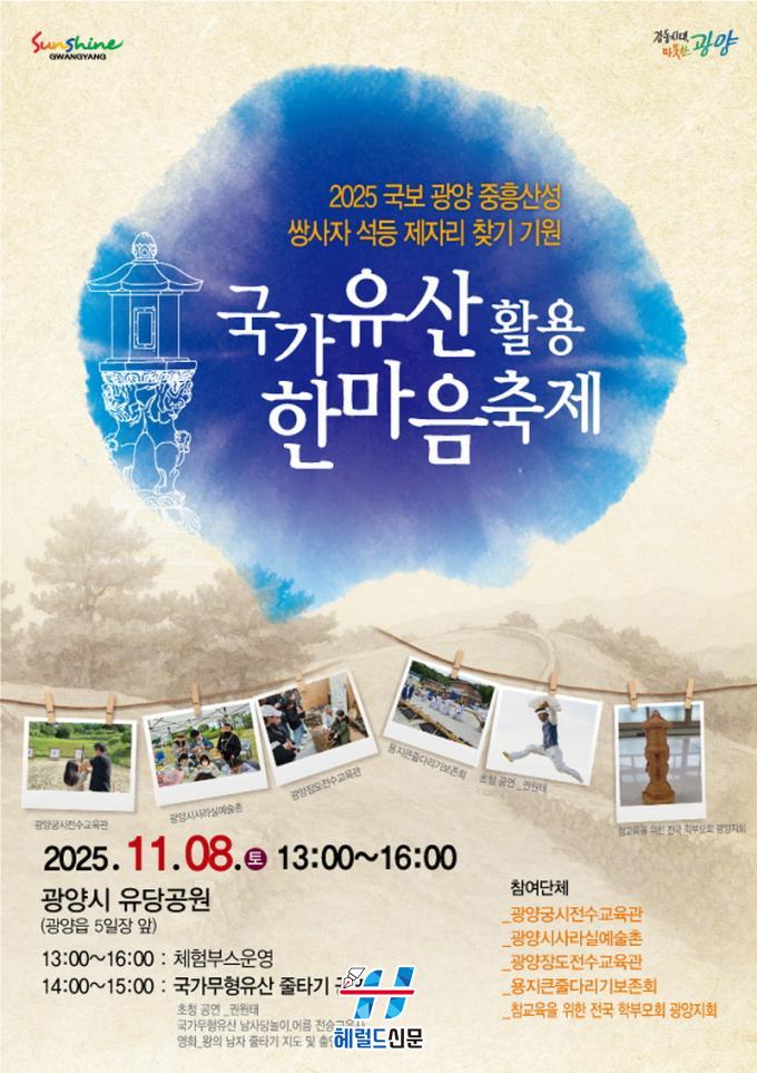 À̹ø Çà»ç¿¡´Â ±¤¾çÀÇ ±¹°¡À¯»êÀ» ³Î¸® ¾Ë¸®±â À§ÇØ Èû½á¿Â ¡ã±¤¾çÀåµµÀü¼ö±³À°°ü ¡ã±¤¾ç±Ã½ÃÀü¼ö±³À°°ü ¡ã¿ëÁöÅ«Áٴٸ®±âº¸Á¸È¸ ¡ã±¤¾ç½Ã»ç¶ó½Ç¿¹¼úÃÌ ¡ãÂü±³À°À» À§ÇÑ Àü±¹Çкθðȸ ±¤¾çÁöȸ 5°³ ´Üü°¡ Âü¿©ÇÑ´Ù.