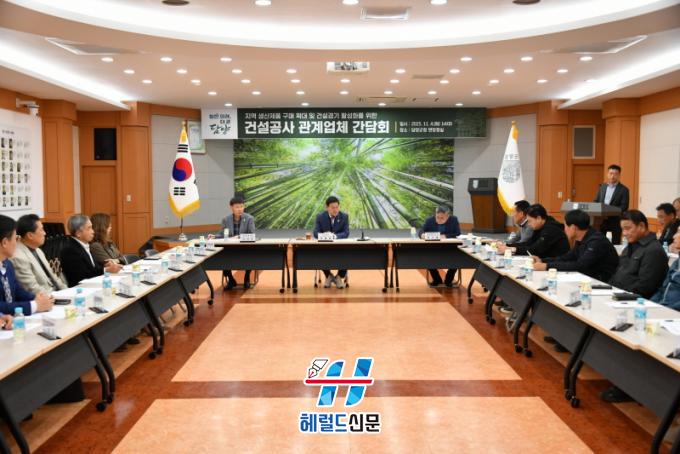 À̹ø °£´ãȸ´Â Áö¿ª °Ç¼³¾÷ü Âü¿© È®´ë¿Í Áö¿ª»ý»êǰ ±¸¸Å ÃËÁøÀ» À§ÇØ ¸¶·ÃµÈ ÀÚ¸®·Î, ±º °ü°èÀÚ¿Í ³ó¾î¾÷Åä¸ñºÐ¾ß ¼³°è»ç, ³ó°ø¡¤»ê¾÷´ÜÁö ´ëÇ¥´Ü, Àü¹®°Ç¼³¾÷Çùȸ ȸ¿ø»ç ´ëÇ¥ µî 38¸íÀÌ Âü¼®Çß´Ù.